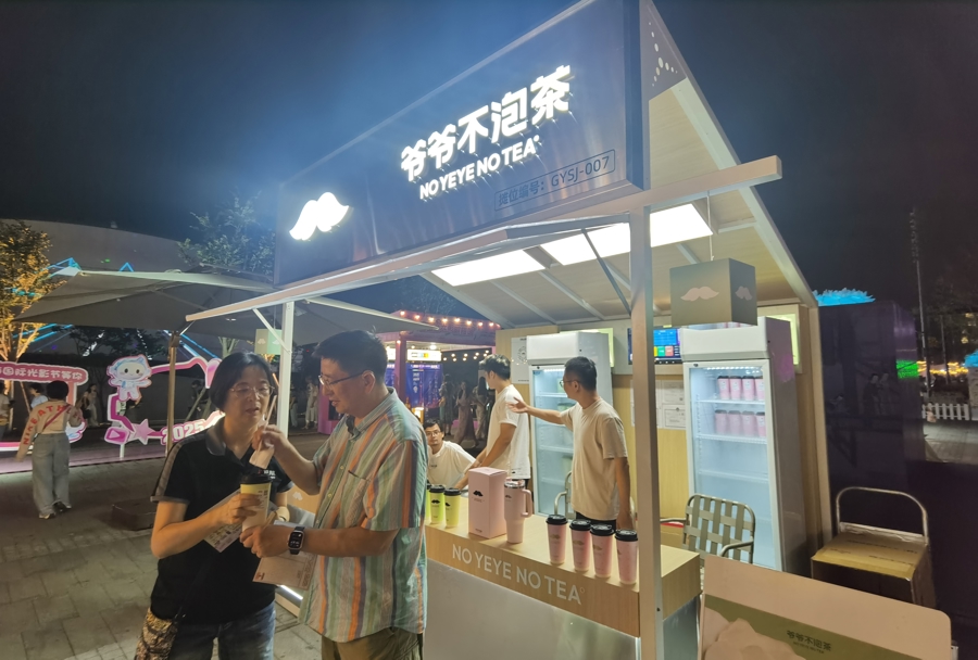 将视线切换到徐汇西岸,紧邻上海国际光影节主会场穹顶艺术中心的“光影市集”内,生意火爆的奶茶铺平均一分钟就卖出一杯奶茶。9月22日晚上8点,爷爷不泡茶的工作人员韩林君回头看了一眼冰柜:“我们是向附近的实体门店下单,现场制作后冷链配送过来,一般100杯下一次单,今天已经补了两次货了。晚上8点,顾客高峰才刚刚开始!”